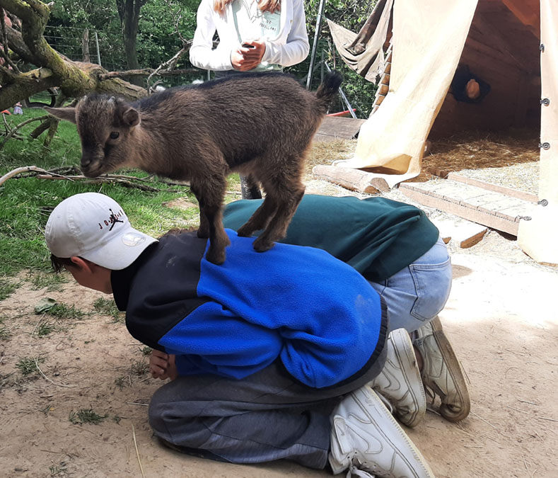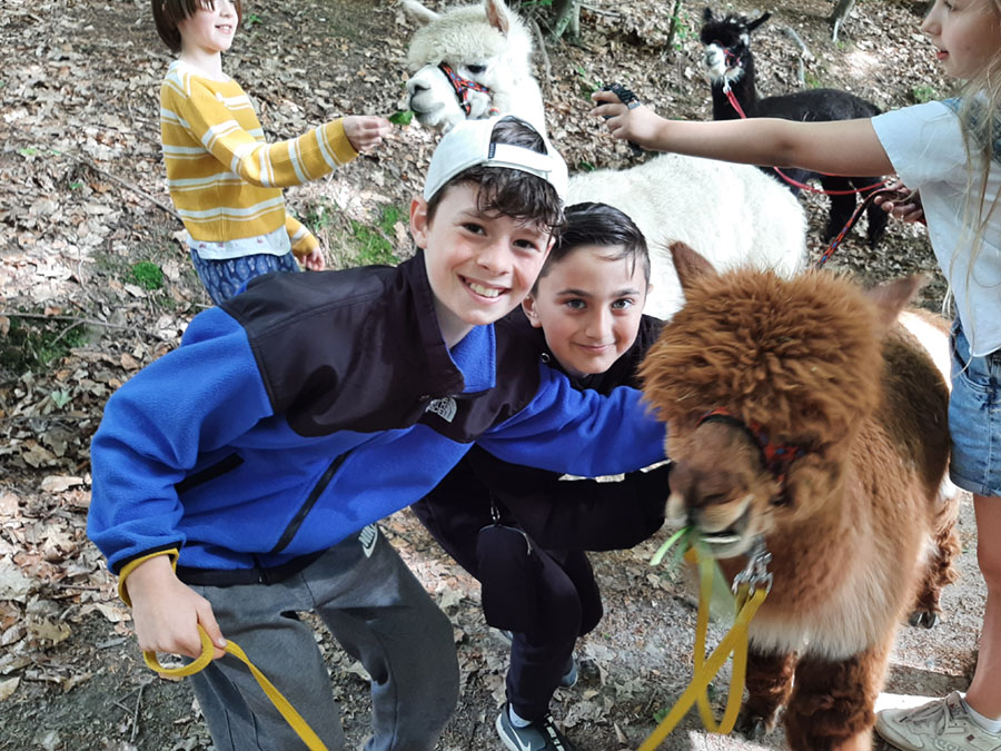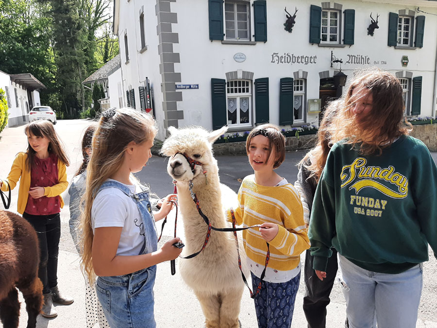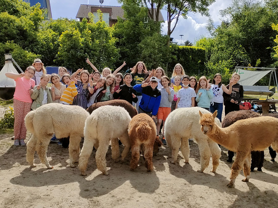 Alpakas on tour! Die Alpakas verbrachten einen schönen Tag im „Lapakatal“ in Solingen und konnten dort ihr Klassentier in echt sehen und bestaunen. Besonders freute sich darüber natürlich das Klassentier Alberto, der nach vier Jahren endlich seine Artgenossen kennenlernen konnte. Glücklich über unseren Besuch waren mit Sicherheit auch die acht ortsansässigen Alpakas, die sich großer Beliebtheit erfreuten und von den Kindern mit vielen Streicheleinheiten und Leckereien belohnt wurden. Das Highlight an diesem Tag war natürlich die Alpakawanderung, bei der alle Kinder jeweils zu zweit ein Alpaka durch die Wälder und Wiesen führen durften. Nach der Wanderung blieb noch genug Zeit zum Spielen und Toben auf dem Gelände. Dort konnten die Kinder auch Ziegen streicheln und mit ihnen spielen.