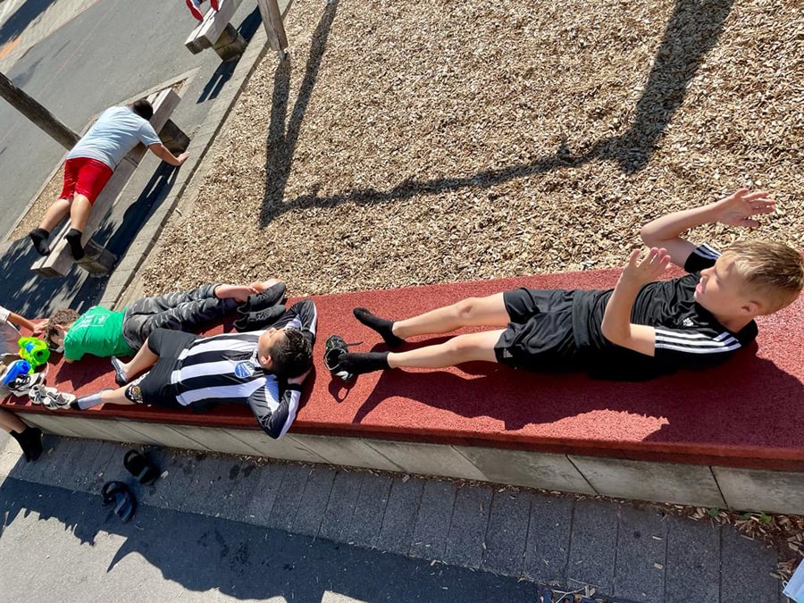 Also wurden Wasser(spritz)spielzeuge mitgebracht, der Schlauch angeschlossen und los ging's. Es wurde gesprüht, gespritzt, gegossen und geschüttet. Alle hatten einen Riesenspaß. Schließlich war der Schulhof und waren alle Teilnehmer:Innen inklusive Lehrerinnen klatschnass aber gut erfrischt. Da tat dann auch eine Ruhepause in der Sonne wieder gut - zum Antrocknen.