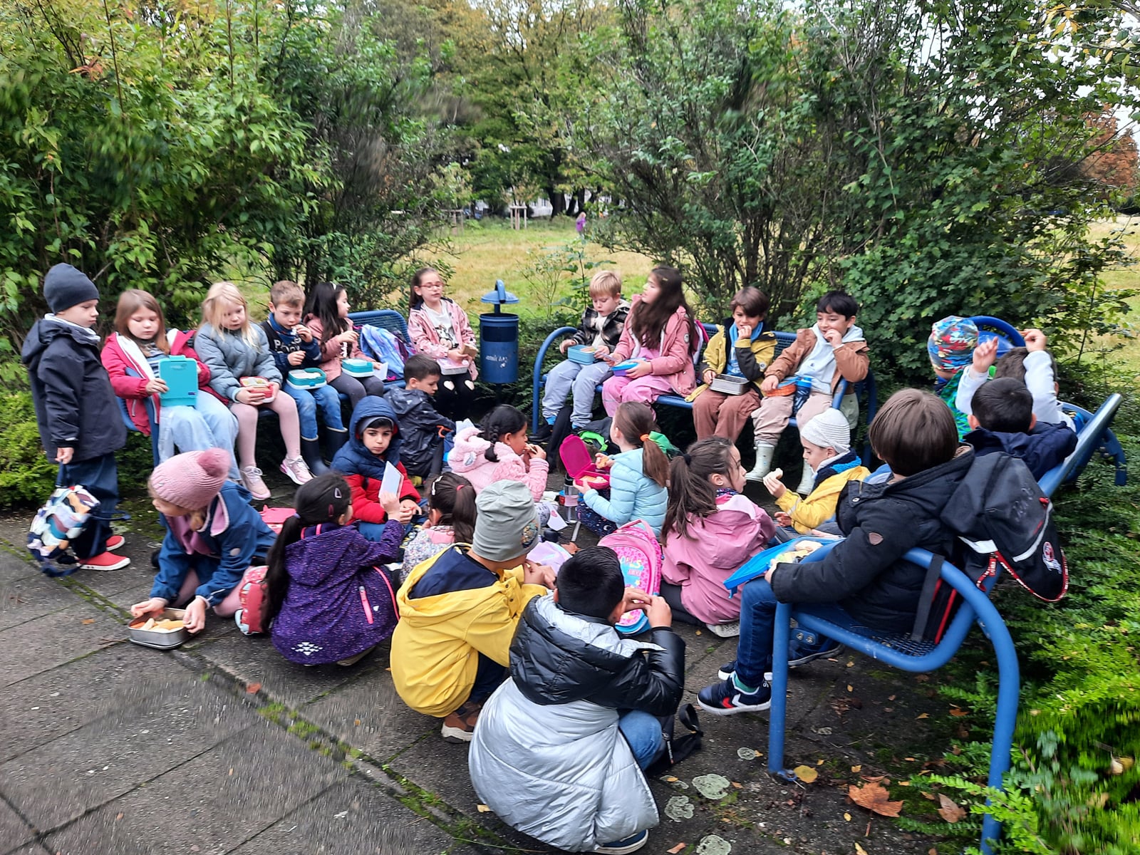 Unmittelbar nach den Herbstferien machten sich die Delfine und Haie auf den Weg zum Gelände der Riehler Heimstätten, um den Herbst zu finden. Wir haben ihn gefunden und etliche Fundstücke mitgebracht, die wir im Kreis geordnet und Begriffen zugeordnet haben. Nun werden wir uns alles noch genauer ansehen.