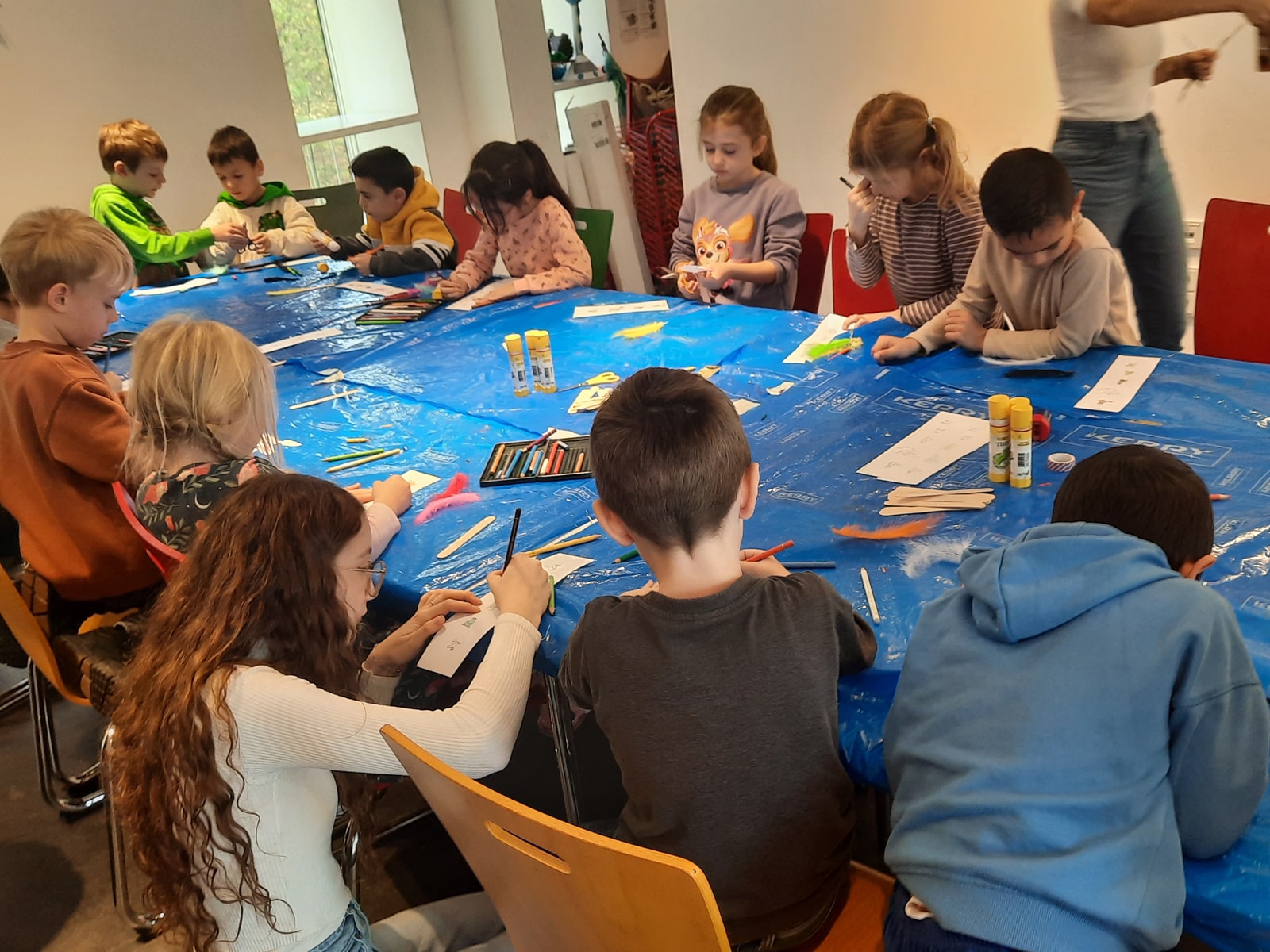 Passend zu unserem Gruselthema der Vorlesewoche, wurde uns dann noch das Bilderbuch Für Hund und Katz ist auch noch Platz vorgelesen und wir durften anschließend eigene kleine Zauberbesen in der Werkstatt basteln.