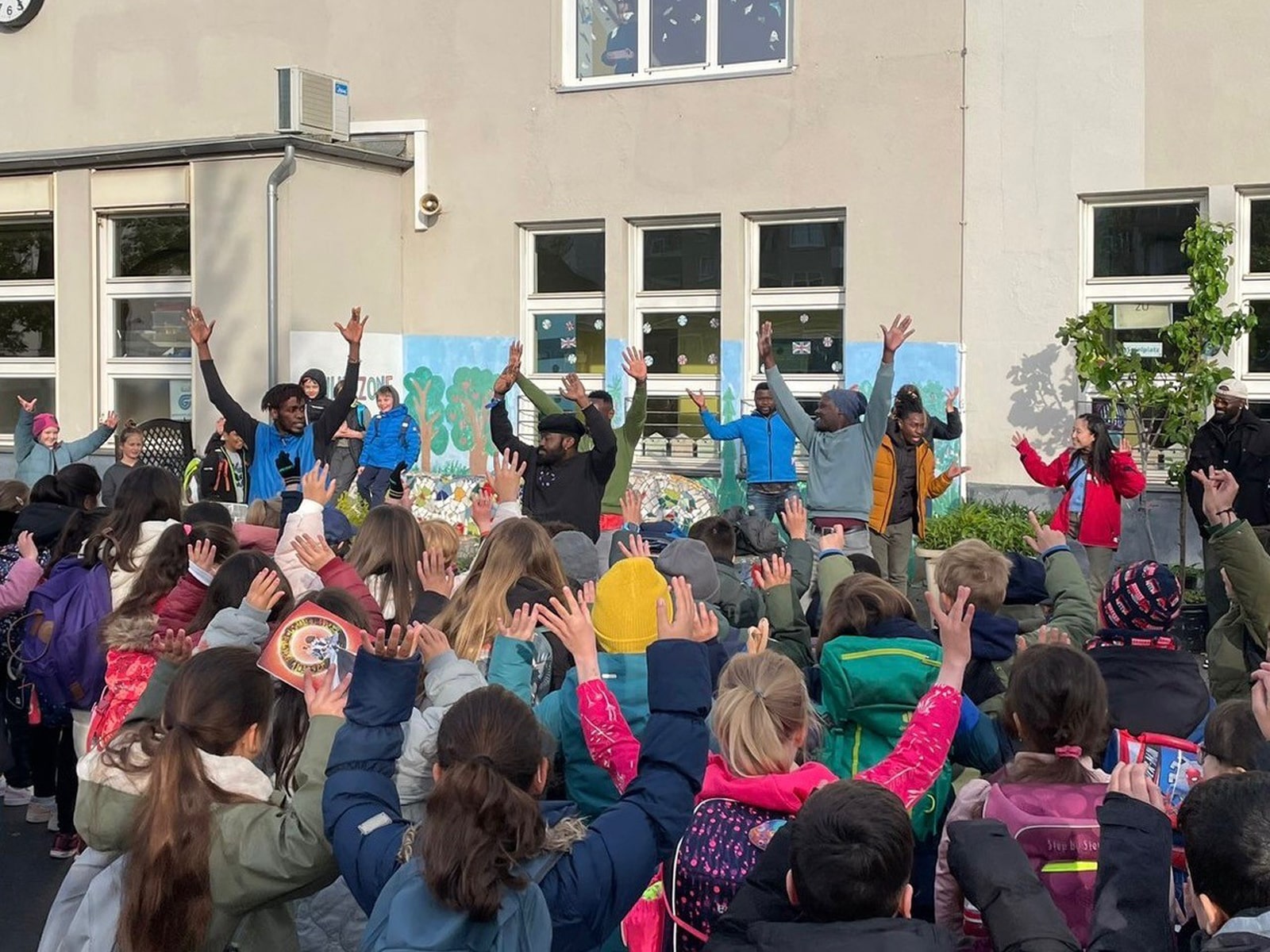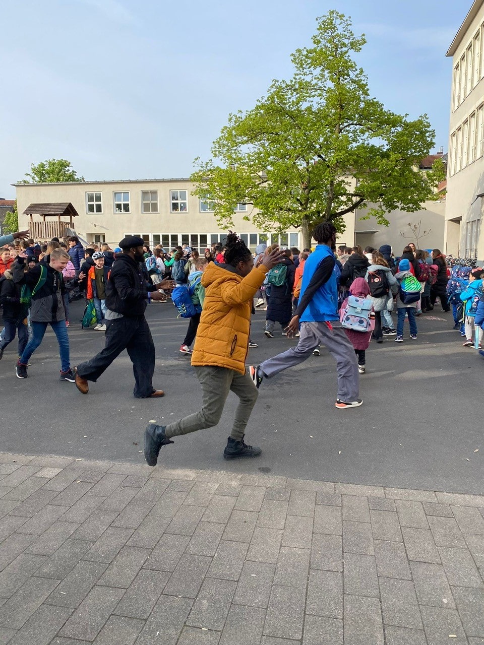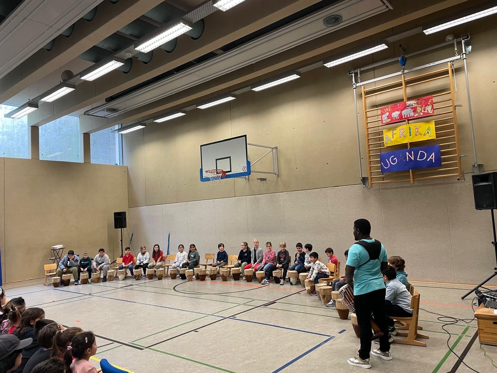 Neben der Individualität unserer Kinder und ihren je unterschiedlichen Zugängen zum Lernen gehört insbesondere auch die Zusammengehörigkeit und das gemeinsame Lernen aller unterschiedlichen Kulturen, Religionen, Geschlechter, …. zum Mittelpunkt unserer Arbeit. Der wertschätzende Umgang miteinander wird immer wichtiger. Da passt die Ostafrikawoche, die alle vier Jahre stattfindet, perfekt ins Konzept. Sie stand in diesem Jahr wieder auf dem Plan und fand vom 21.-24.4. statt. Gäste der kooperierenden Vereine Abawamu e.V./Deutschland und ewaka/Uganda reisten an und arbeiteten mit unseren Kindern. Sie kamen aus Uganda, Myanmar und Deutschland, waren v.a. professionelle Tänzer und Trommler und die Umgangssprache in dieser Woche war vorwiegend Englisch – hier half den Kindern der Englischunterricht ab Klasse 1 und alle kamen schnell miteinander ins Gespräch. Während der Woche lernten die Kinder in altersgemischten Gruppen und auf dem Stundenplan standen Landeskunde, Beat-boxen, Singen/Musizieren, Trommeln, Tanzen, Kochen und Basteln (z.B. von Kronkorkenrasseln, Ketten aus Papierperlen, …). Die Kinder machten überall begeistert mit, sodass am Ende in einer Show erfolgreich präsentiert werden konnte, was die Kinder gelernt hatten. Viele Kinder und Eltern haben gefragt, ob „wir das nicht schnell noch mal wiederholen können“.