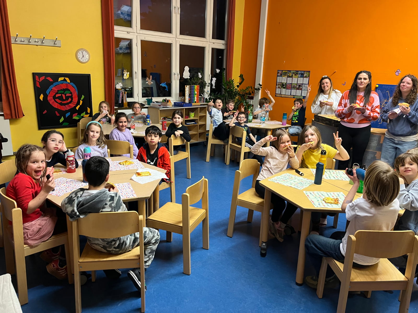 Mit Schlafsäcken, Isomatten, Kuscheltieren sowie kleinen Koffern und Rucksäcken ausgerüstet, richteten sich die Kinder der 2a ihre Schlafplätze im Klassenraum gemütlich ein. Nach dem Einrichten gab es zur Stärkung erst einmal Familienpizza sowie Zeit zum Spielen und Lesen.