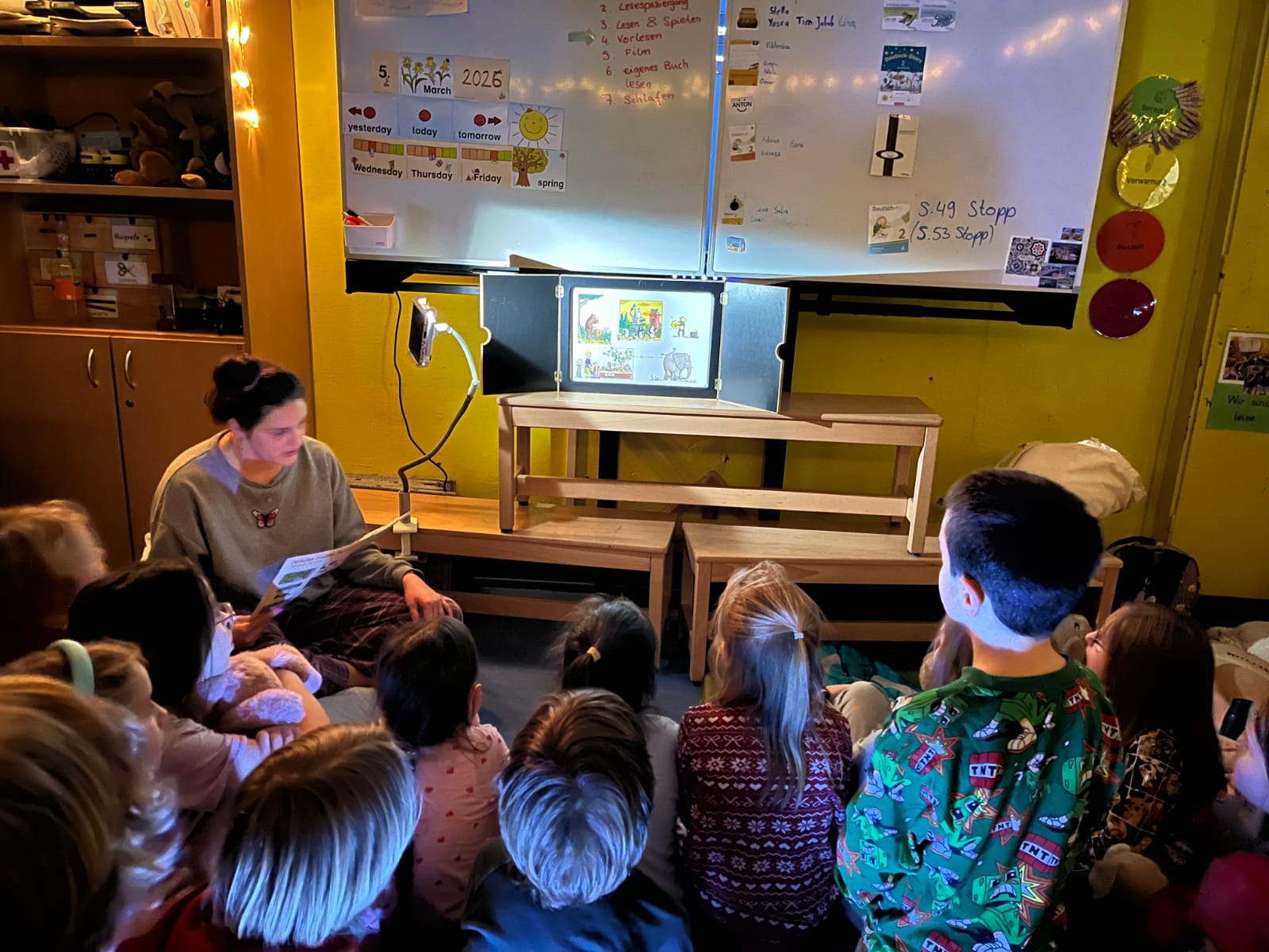 Nach dem Umziehen in die Schlafanzüge und dem Zähneputzen wurde noch in den Schlafsäcken gelesen und gespielt. Einige mutige Elefantenkinder wagten sogar eine kleine, leicht gruselige Nachtwanderung durch verlassene Ecken des Schulgebäudes. Zusätzlich wurde für interessierte Kinder eine gemeinsame Geschichte mit dem Kamishibai erzählt, während andere lieber in ihren eigenen Büchern schmökerten.